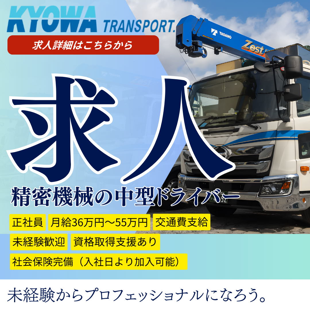 精密機械の輸送業務です。荷積みはユニック車のクレーンを使用し、荷下ろしは軒先で行うため、原則として手作業での荷運びはありません。